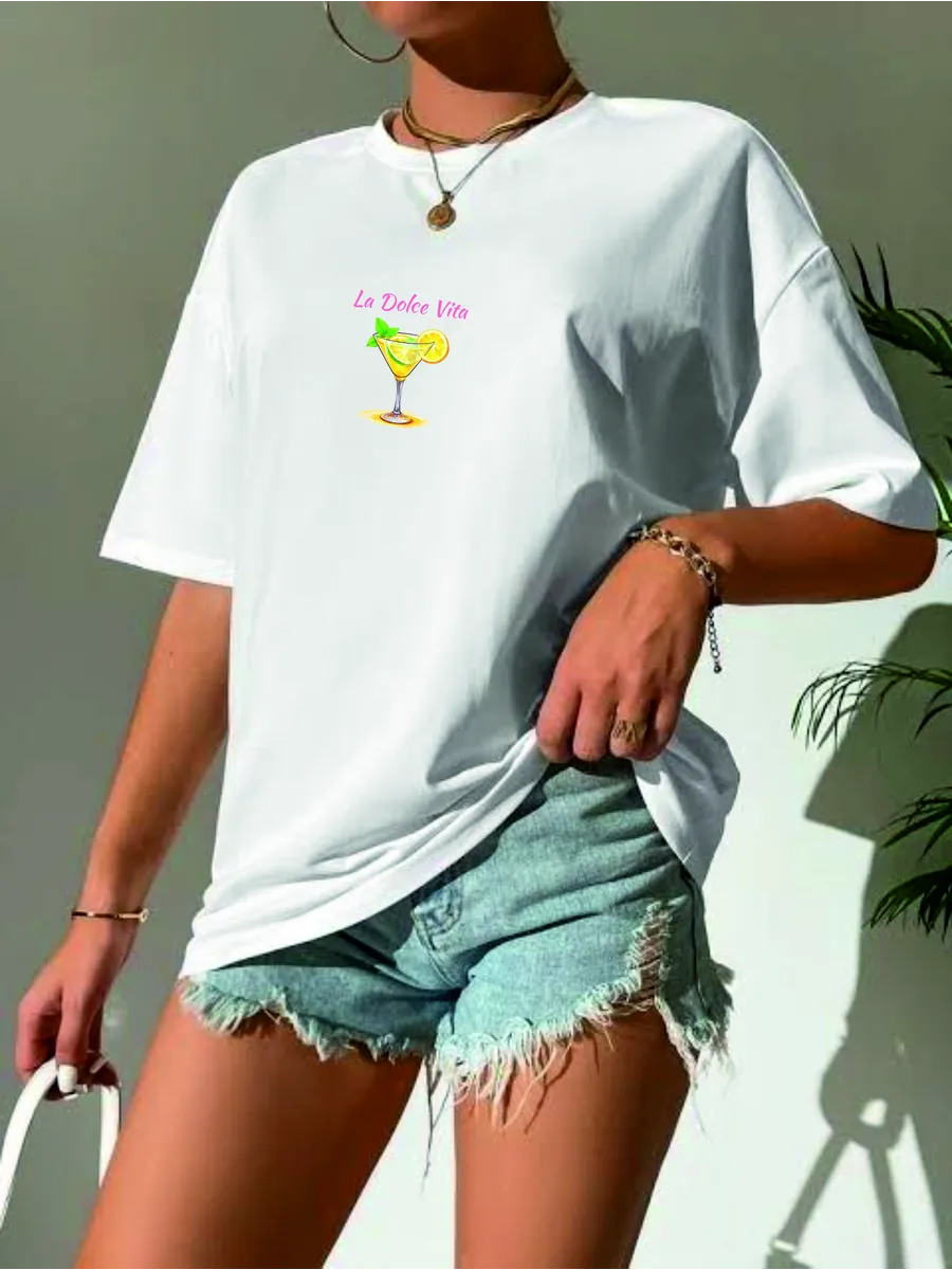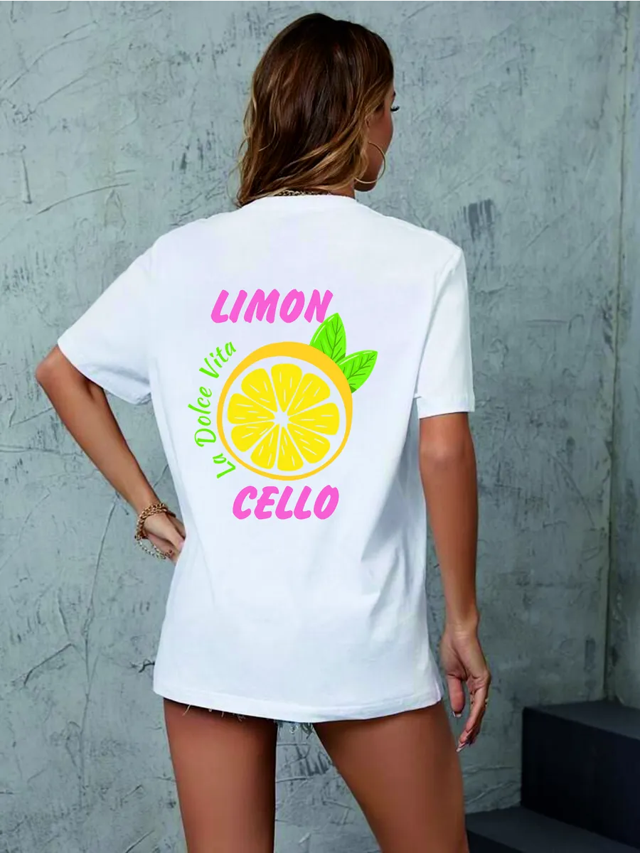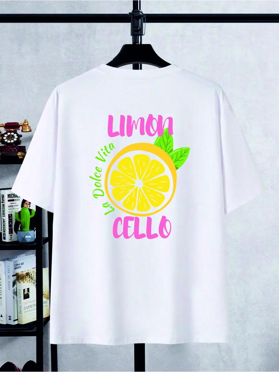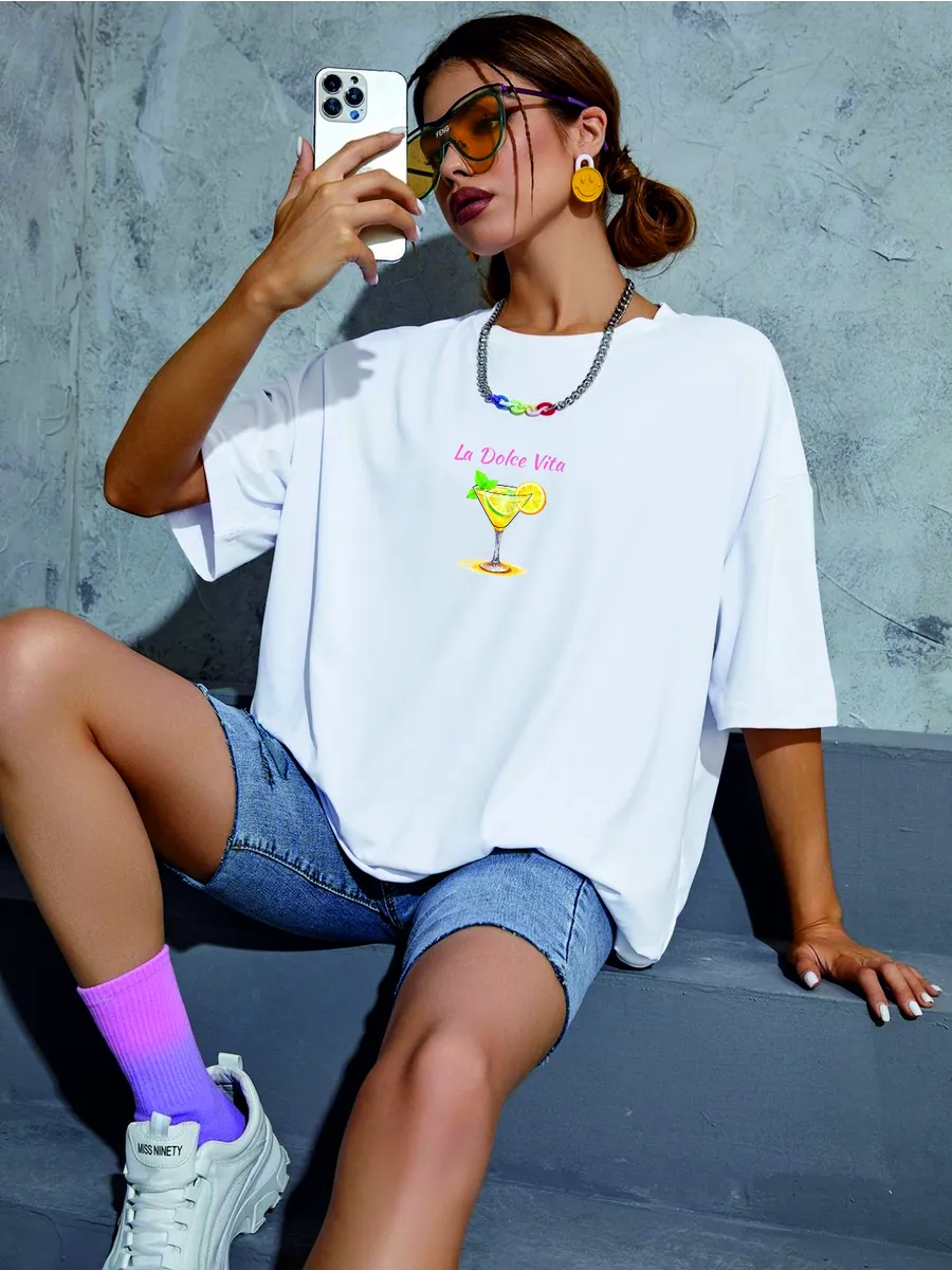 Крой oversize позволяет свободно двигаться, а спущенные рукава придают образу непринужденности и легкости. Такой стиль подходит для девушек разных возрастов и телосложений - от подростков до женщин, ценящих комфорт и оригинальность. Лимонный принт добавляет яркий акцент и создает позитивное настроение, делая футболку подходящей для любых случайных встреч и прогулок.
