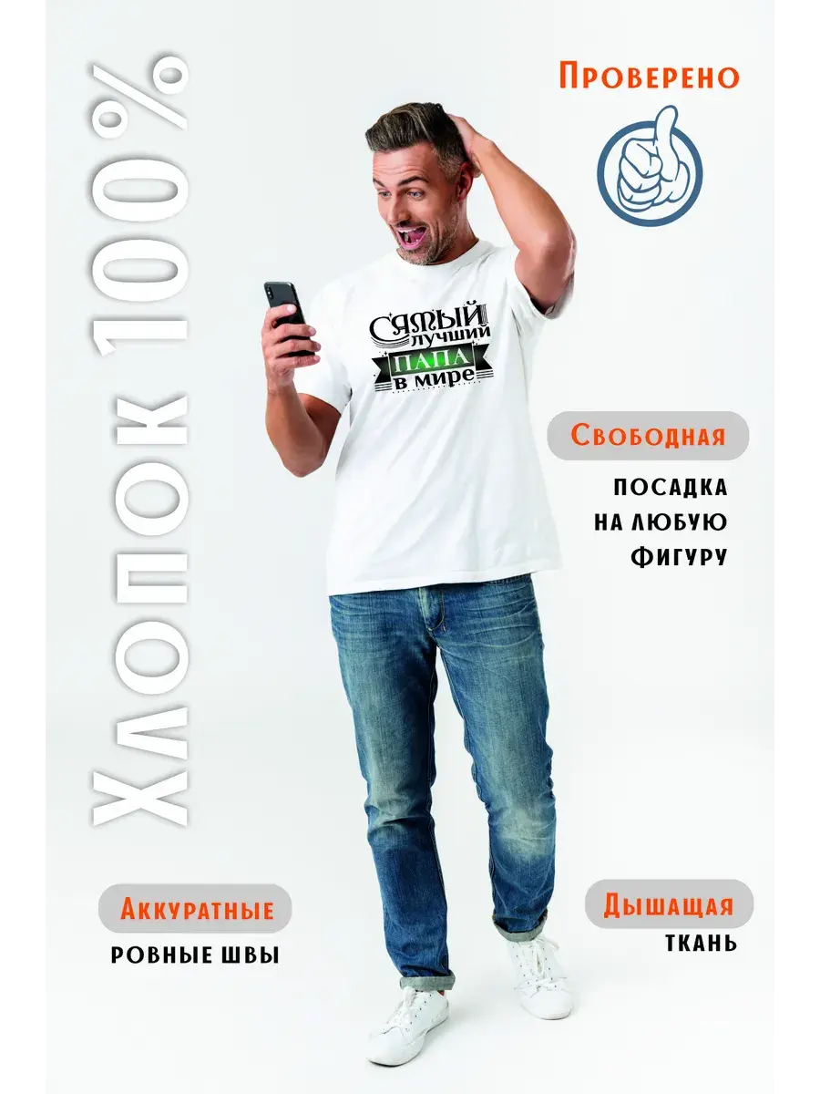 Футболка белая Папа Самый лучший в мире от SEZON-PRINTOV - это стильный и комфортный выбор для повседневной носки. Изготовленная из 100% хлопка, она приятна к телу и позволяет коже дышать. Унисекс-дизайн с ярким принтом и надписью "Самый лучший" делает ее универсальным подарком для друзей и близких, а также отличным вариантом для создания яркого образа в любом стиле.