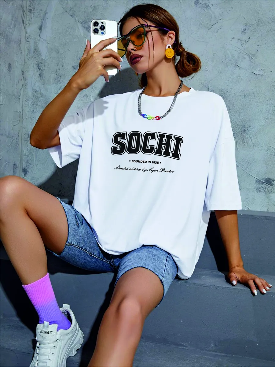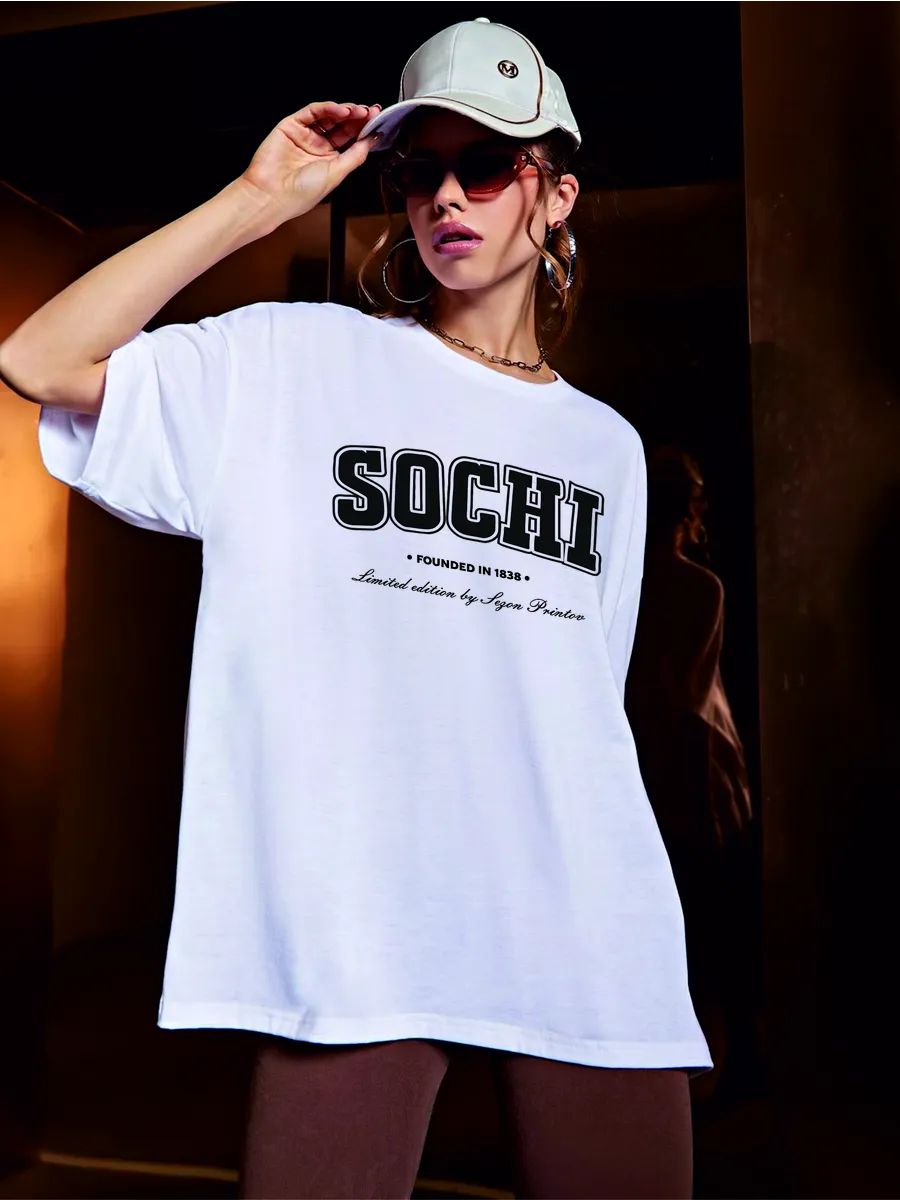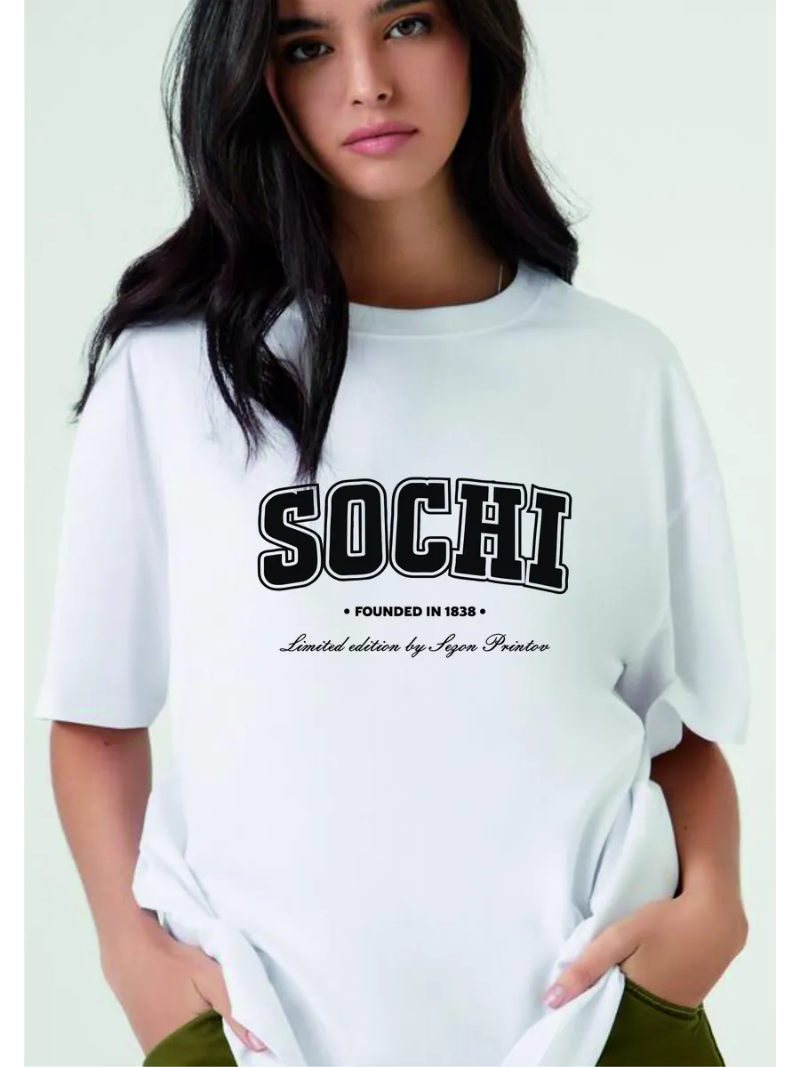 Яркий дизайн: стильный принт с надписью SOCHI добавляет образу индивидуальности и соответствует актуальным трендам.