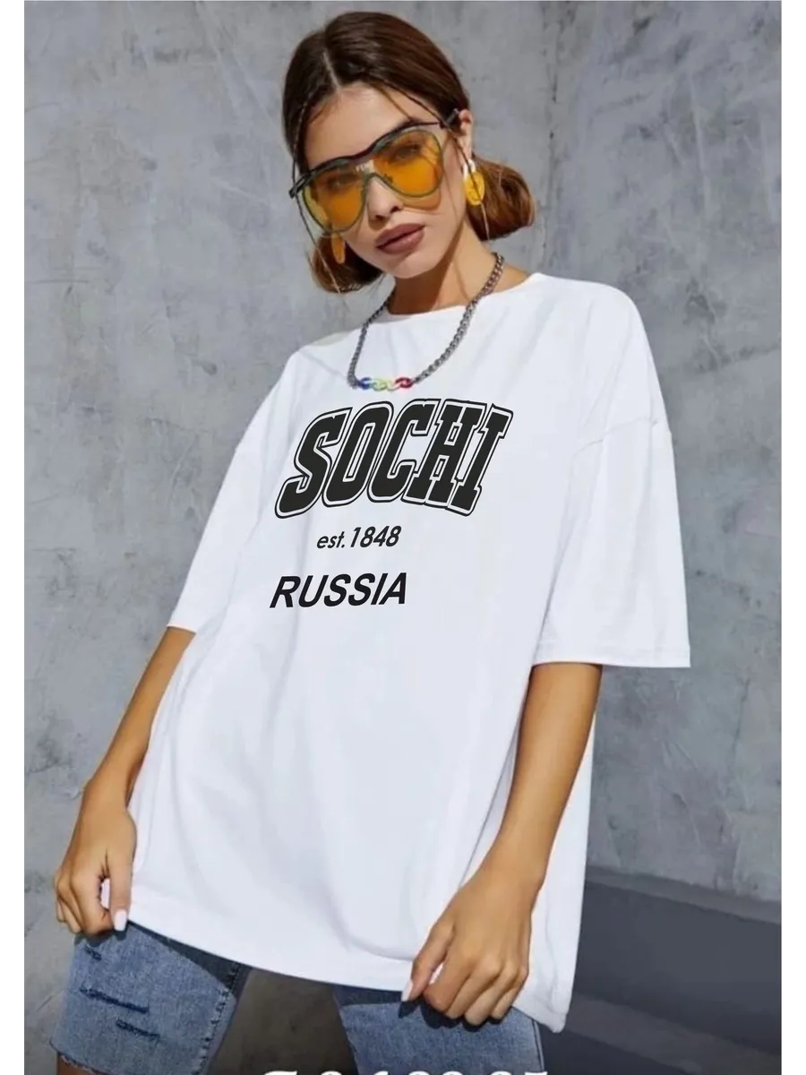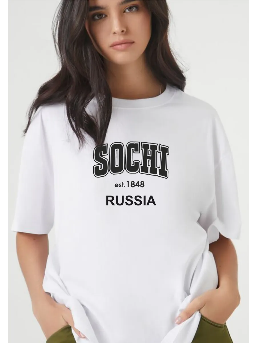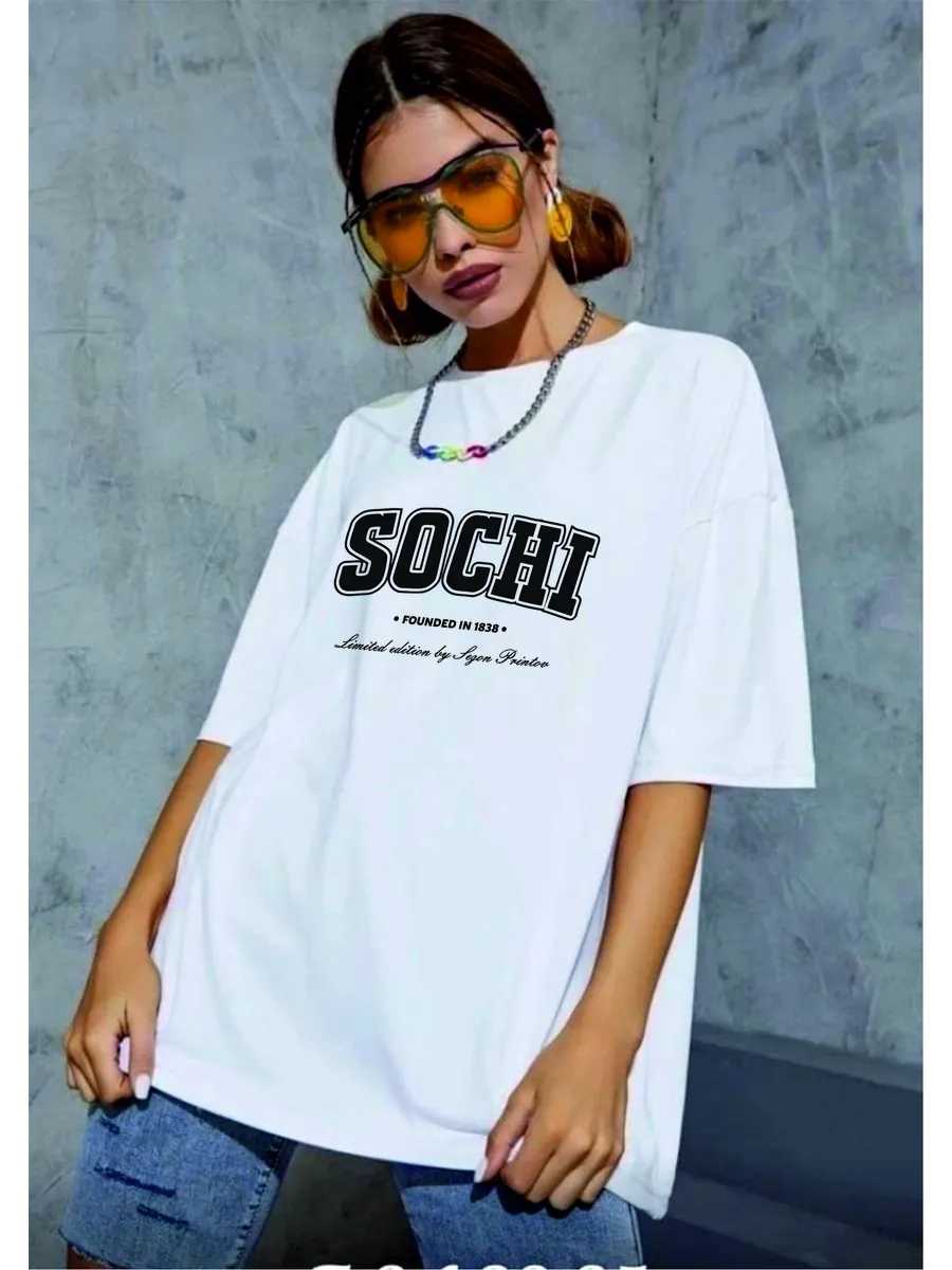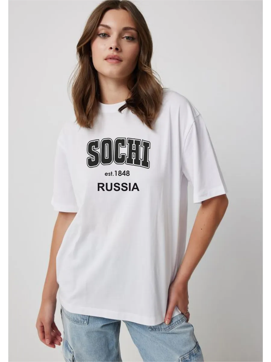 Яркий дизайн: стильный принт с надписью SOCHI добавляет образу индивидуальности и соответствует актуальным трендам.
